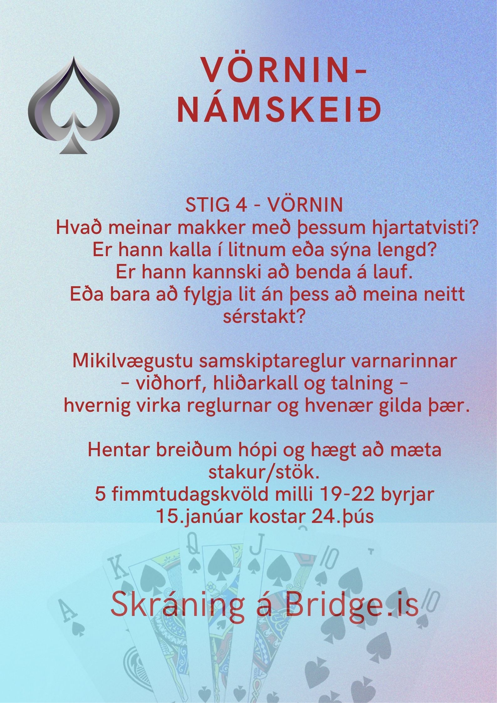 Bridgeskólinn heldur reglulega námskeið í Bridge. Námskeiðin henta breiðum hópi spilara og ekkert mál að mæta stakur/stök.